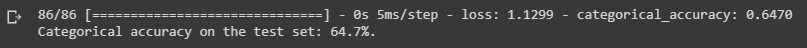 _, categorical_acc = our_model.evaluate(test_dataset) print(f"Categorical accuracy on the test set: {round(categorical_acc * 100, 2)}%.")