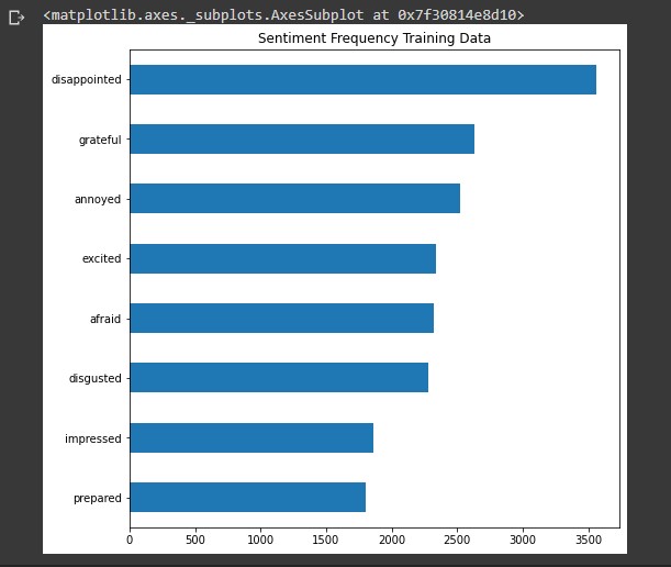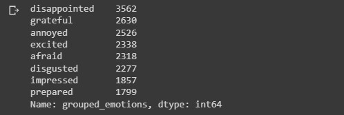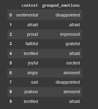def emotion_grouping(df_column):Use grouping function with the context column in the training data and add grouped column to dataframeexcited_list = ['excited', 'surprised', 'joyful'] afraid_list = ['afraid', 'terrified', 'anxious', 'apprehensive'] disgusted_list = ['disgusted', 'embarrassed', 'guilty', 'ashamed'] annoyed_list = ['angry', 'annoyed', 'jealous', 'furious'] grateful_list = ['faithful', 'trusting', 'grateful', 'caring', 'hopeful'] disappointed_list = ['sad', 'disappointed', 'devastated', 'lonely', 'nostalgic', 'sentimental'] impressed_list = ['proud', 'impressed', 'content'] prepared_list = ['anticipating', 'prepared', 'confident'] new_emotion_group_list = [] for index, value in df_column.items():  if value in excited_list:    new_emotion_group_list.append('excited')  elif value in afraid_list:    new_emotion_group_list.append('afraid'))  elif value in disgusted_list:    new_emotion_group_list.append('disgusted')  elif value in annoyed_list:    new_emotion_group_list.append('annoyed')  elif value in grateful_list:    new_emotion_group_list.append('grateful')  elif value in disappointed_list:    new_emotion_group_list.append('disappointed')  elif value in impressed_list:    new_emotion_group_list.append('impressed')  elif value in prepared_list:    new_emotion_group_list.append('prepared') return new_emotion_group_list