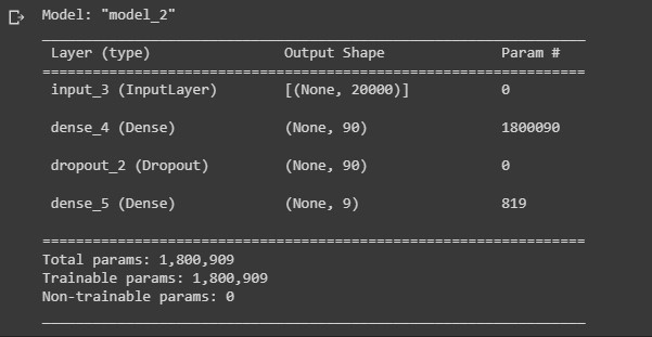 Since we're using a simple bag-of-words approach for our machine learning model, we'll keep the architecture simple to reduce the chances of our model overfitting the training data. The model consists of a regular densely-connected neural network layer with ReLU as the activation function. We'll use 90 units for the output of this layer. To reduce overfitting we'll apply a 0.5 dropout layer. Since our task is a single-label multiclass classification problem, we'll apply the softmax function for our output layer. Our output will be a vector of the probability distribution of the 9 possible sentiments. Remember that we added the UNK out of vocabulary token as a possible sentiment.# create make_model function def make_model(max_tokens=max_tokens):Call our model and display the summary.inputs = tf.keras.Input(shape=(max_tokens,)) x = tf.keras.layers.Dense(90, activation='relu')(inputs) x = tf.keras.layers.Dropout(0.5)(x) outputs = tf.keras.layers.Dense(9, activation='softmax')(x) model = tf.keras.Model(inputs,outputs) return model
