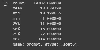 This process is a basic form of feature engineering that aims to erase encoding differences that you don't want your model to have to deal with. The simplest and most widespread standardization schemes include converting the text to lowercase, removing punctuation characters, and represent each tokenized text in numerical form. All this can be done using the keras TextVectorization layer. The output for this layer depends on your choice for how the text should be represented. There are 2 notable methods for text classification, the bag-of-words approach and the sequence model. In order to determine which method to use, look at the ratio between the number of samples in your training data and the mean number of words per sample. If the ratio is small-less than 1500, then the bag of words model will perform better. If the ratio is higher than 1500 the sequence model works best. Let's get the percentile estimates for the sequence lengths of the promptstrain_dataframe["prompt"].apply(lambda x: len(x.split(" "))).describe()