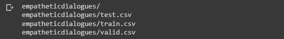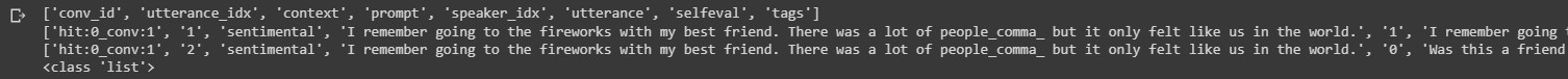 # load csv file splitname = "train" path = '/content/empatheticdialogues' # create variable for training dataset train_df = open(os.path.join(path, f"{splitname}.csv")).readlines() # print first two indices print(train_df[0].strip().split(",")) print(train_df[1].strip().split(",")) print(type(train_df))