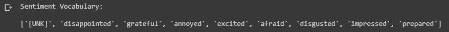 Deep learning models, being differentiable functions, can only process numeric tensors: they can't take raw text as inputs. Vectorizing text is the process of transforming text into numeric tensors. This process involves a few key steps which includes standardizing text, tokenization, and converting each token into a numerical vector. We'll start by vectorizing our target labels, the 8 emotions we'll use for our sentiment analysis. Processing output labels We'll vectorize our target labels by using the keras StingLookup layer which maps string features to integer indices. By switching the output mode to 'multi_hot', input strings are encoded into an array where each dimension corresponds to an element in the vocabulary. A 'OOV' (out of vocabulary) token is created to cover any labels in the validation or test data that is not in the training data. Each target label will be a (1,9) shaped numeric array consisting of a 1 for the target label and 0's for the non-target labels.sentiment = tf.ragged.constant(train_dataframe['grouped_emotions'].values) lookup = tf.keras.layers.StringLookup(output_mode="multi_hot") lookup.adapt(sentiment) # the sentiment vocabulary added the [UNK] OOV token for unknown values sentiment_vocab = lookup.get_vocabulary() # [UNK] token created to cover unknown emotion sentiments print("Sentiment Vocabulary:\n") print(sentiment_vocab)