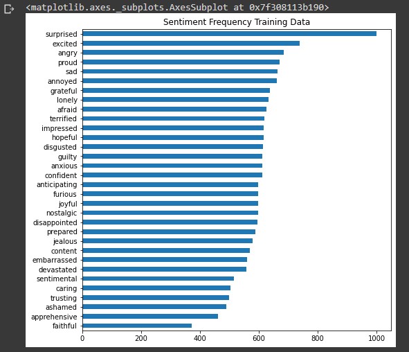 train_dataframe.context.value_counts().sort_values().plot(kind = 'barh', linewidth=20, figsize = [8,8], title='Sentiment Frequency Training Data')
