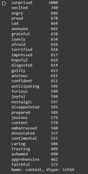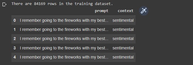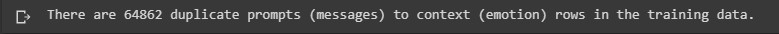 total_duplicate_train = sum(train_dataframe[['prompt','context']].duplicated()) print(f"There are {total_duplicate_train} duplicate prompts (messages) to context (emotion) rows in the training data.")