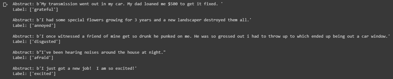 train_dataset = make_dataset(train_dataframe, is_train=True) validation_dataset = make_dataset(valid_dataframe, is_train=False) test_dataset = make_dataset(test_dataframe, is_train=False)Lets see if our function was successful by taking a batch of 5 from our train_dataset and displaying the text input with the associated target label. We'll use the inverted multi-hot function to convert the labels as its string version.