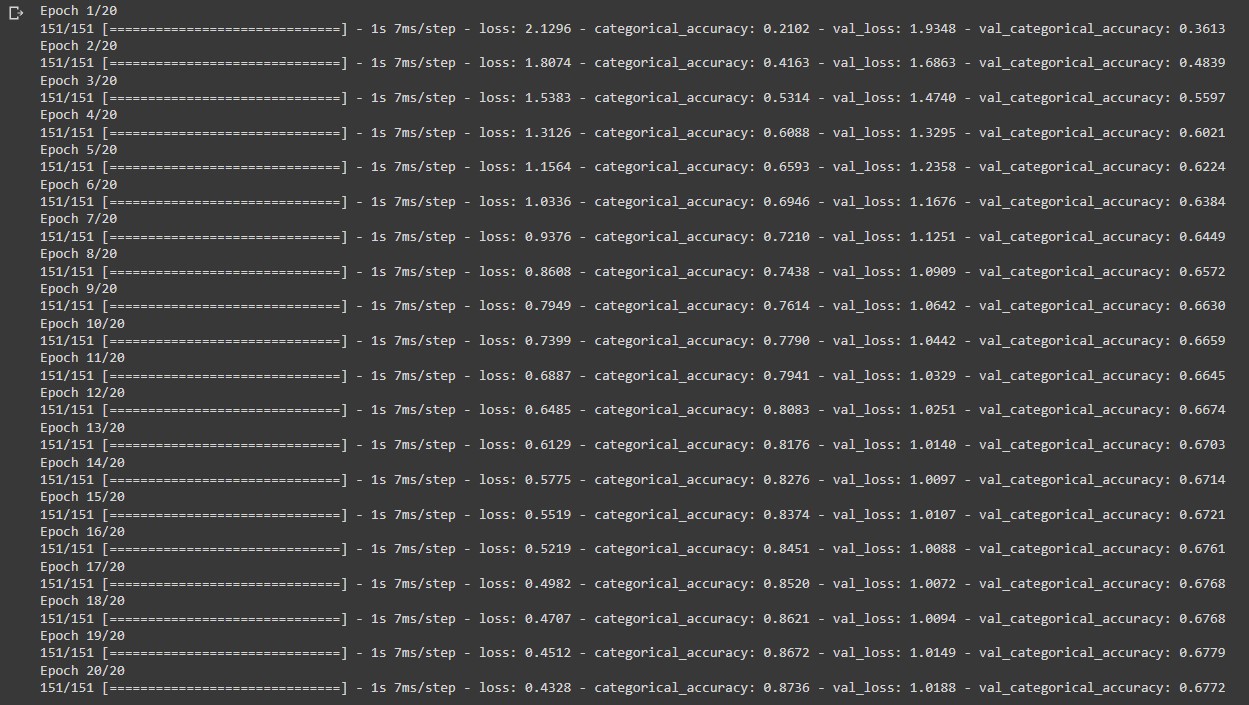 #custom learning rate opt_rmsprop = tf.keras.optimizers.RMSprop(learning_rate=1e-4) epochs = 20 our_model.compile(optimizer=opt_rmsprop, loss ='categorical_crossentropy', metrics=['categorical_accuracy']) history = our_model.fit(train_dataset, validation_data=validation_dataset, epochs=epochs)