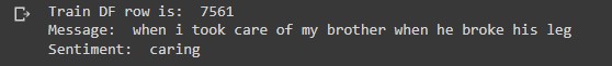 Let's display a random message from the training data with the accompying sentiment. Using a random index from the dataset.idx = np.random.randint(train_dataframe.shape[0]) print('Train DF row is: ', idx) print('Message: ', train_dataframe['prompt'].iloc[idx]) print('Sentiment: ', train_dataframe['context'].iloc[idx])
