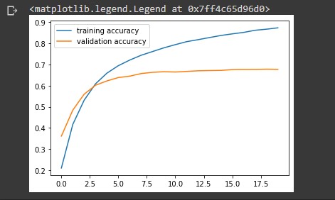 # visualize the accuracy during training train_accuracy = history.history['categorical_accuracy'] val_accuracy = history.history['val_categorical_accuracy'] plt.plot(train_accuracy, label='training accuracy') plt.plot(val_accuracy, label='validation accuracy' plt.legend()