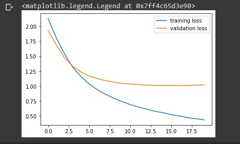 # visualize the training and validation loss train_loss = history.history['loss'] val_loss = history.history['val_loss'] plt.plot(train_loss, label = 'training loss') plt.plot(val_loss, label = 'validation loss') plt.legend()